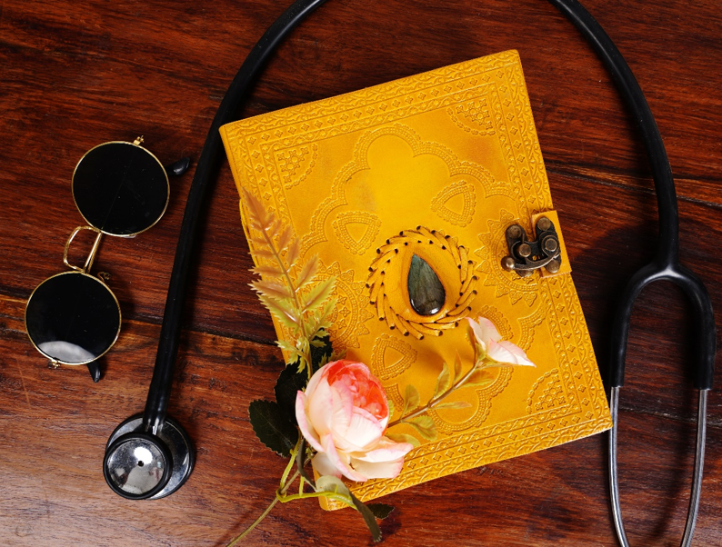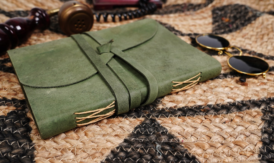 The strap is cut from the same leather as the cover for durability and aesthetic continuity. It wraps securely around the diary to keep it closed, even during travel.